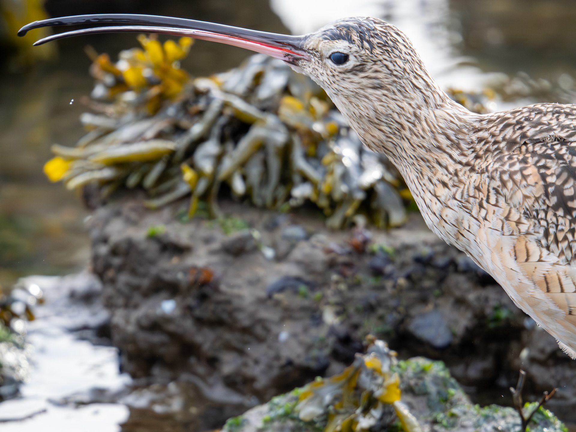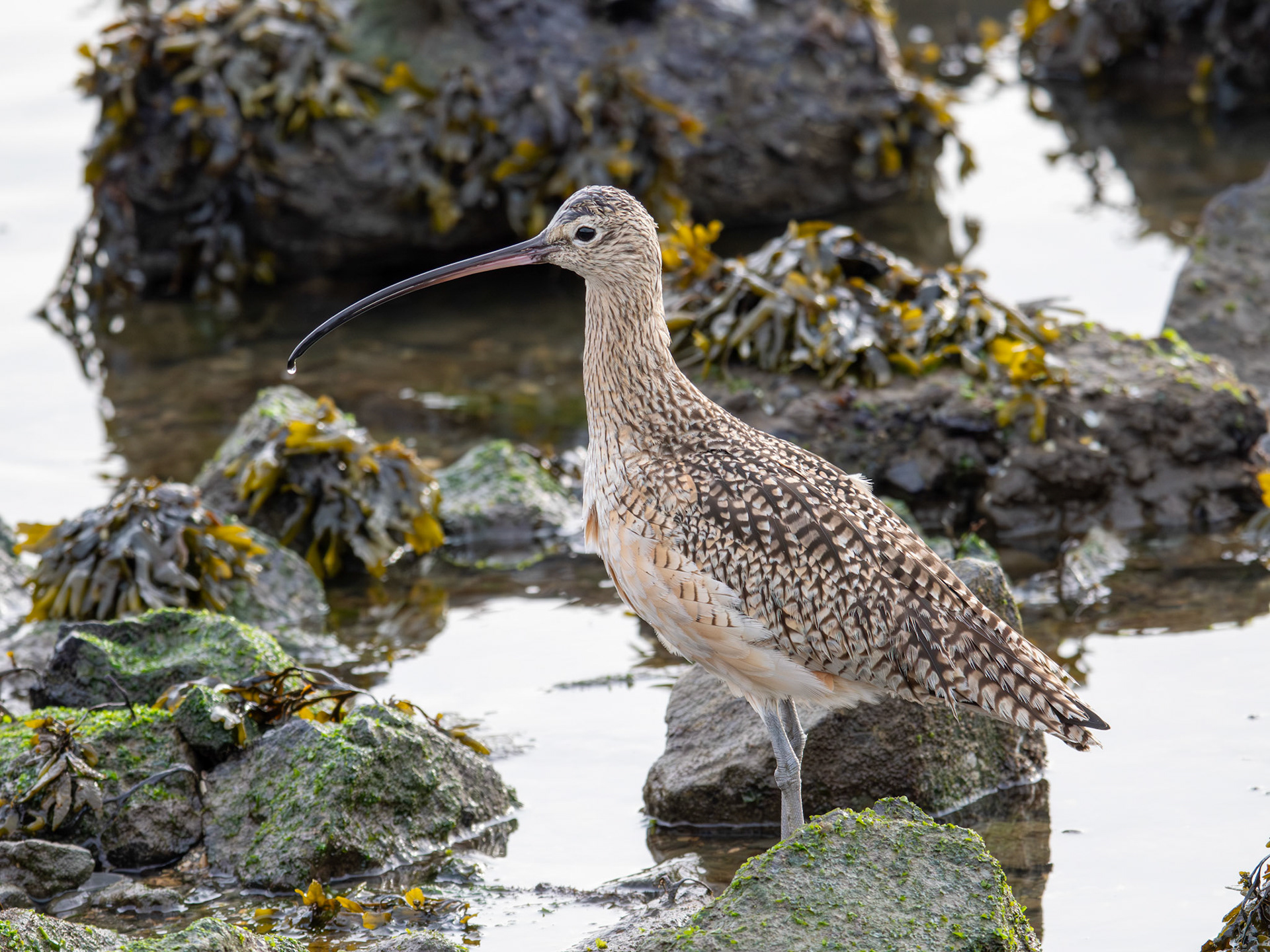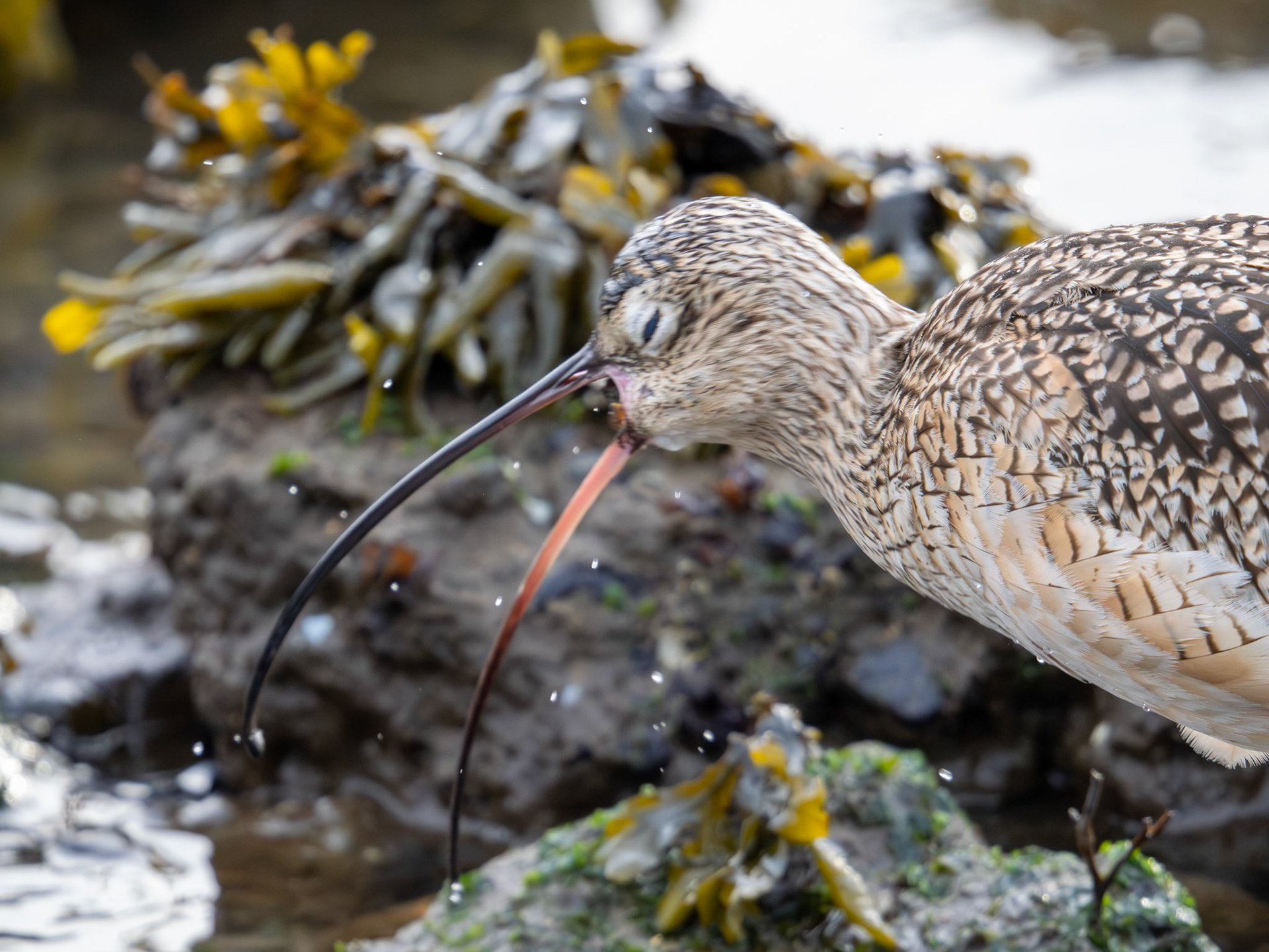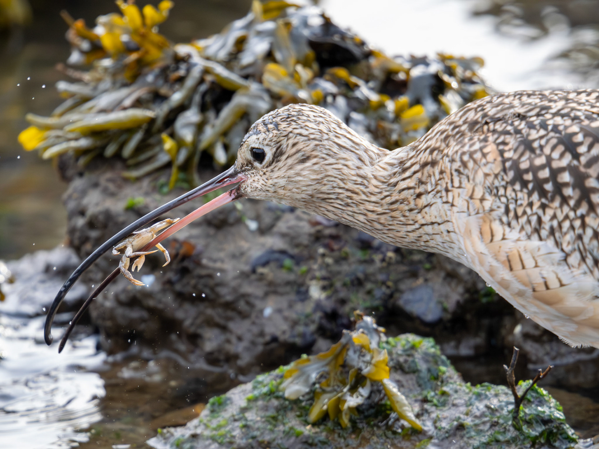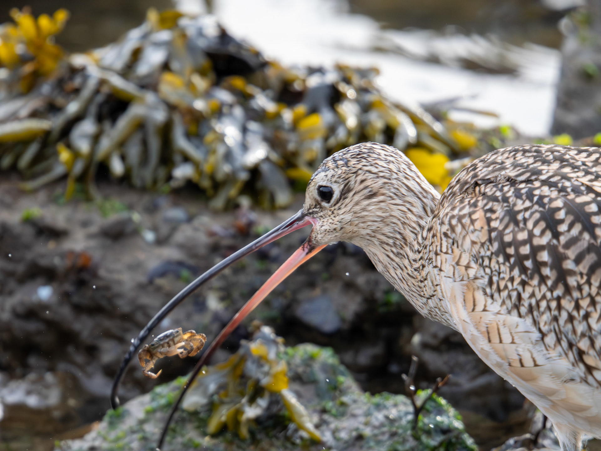 A Long-billed Curlew catches a crab (Alameda, CA)