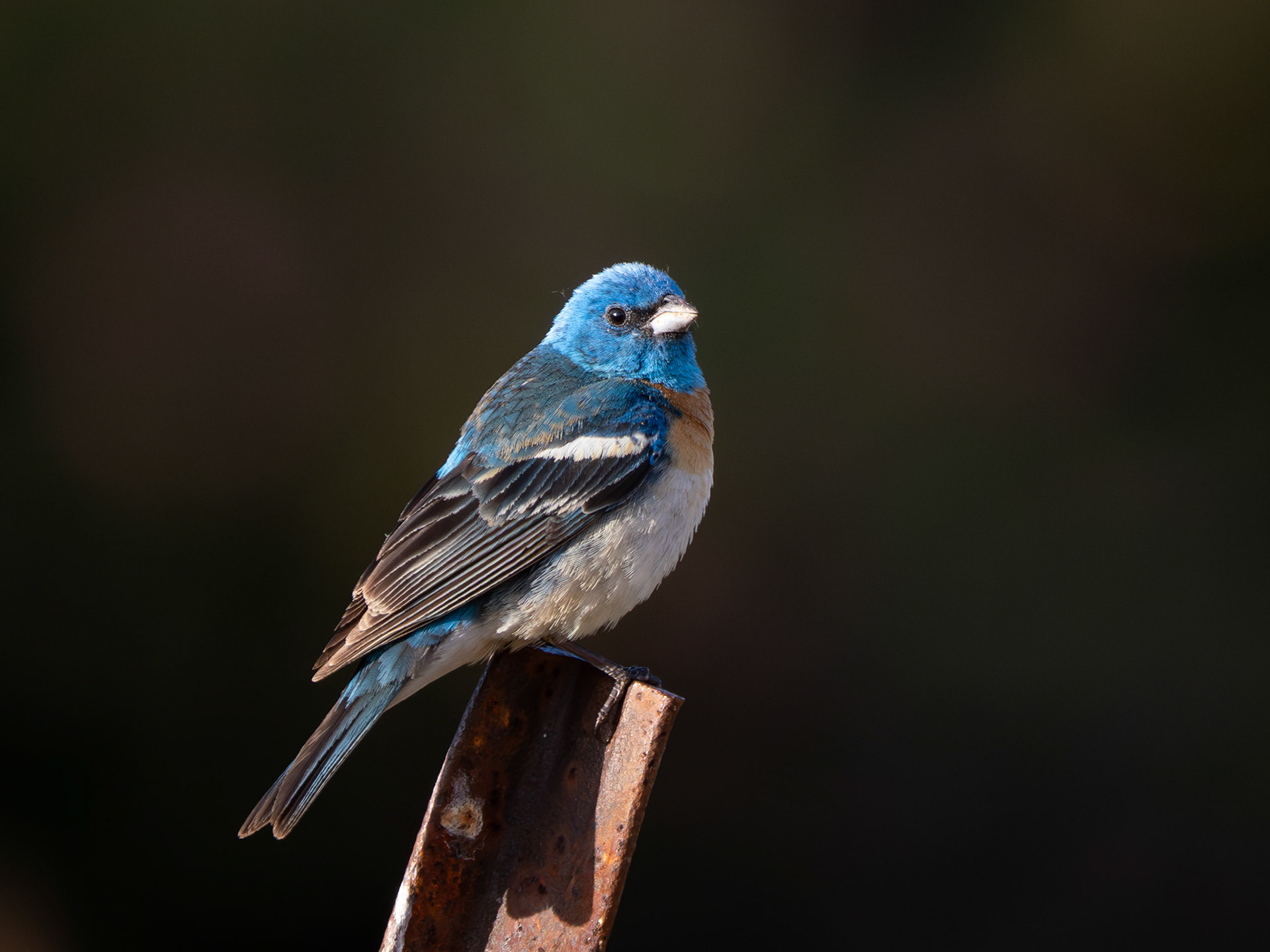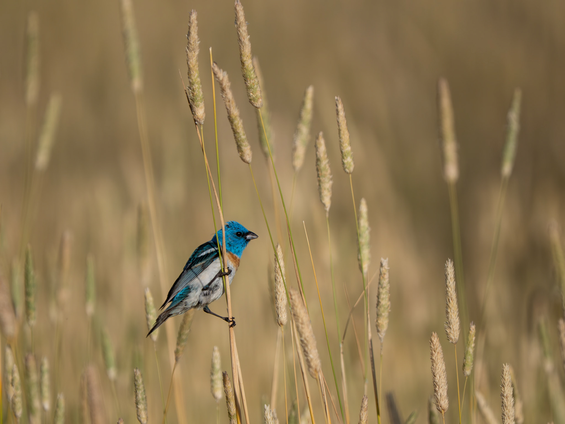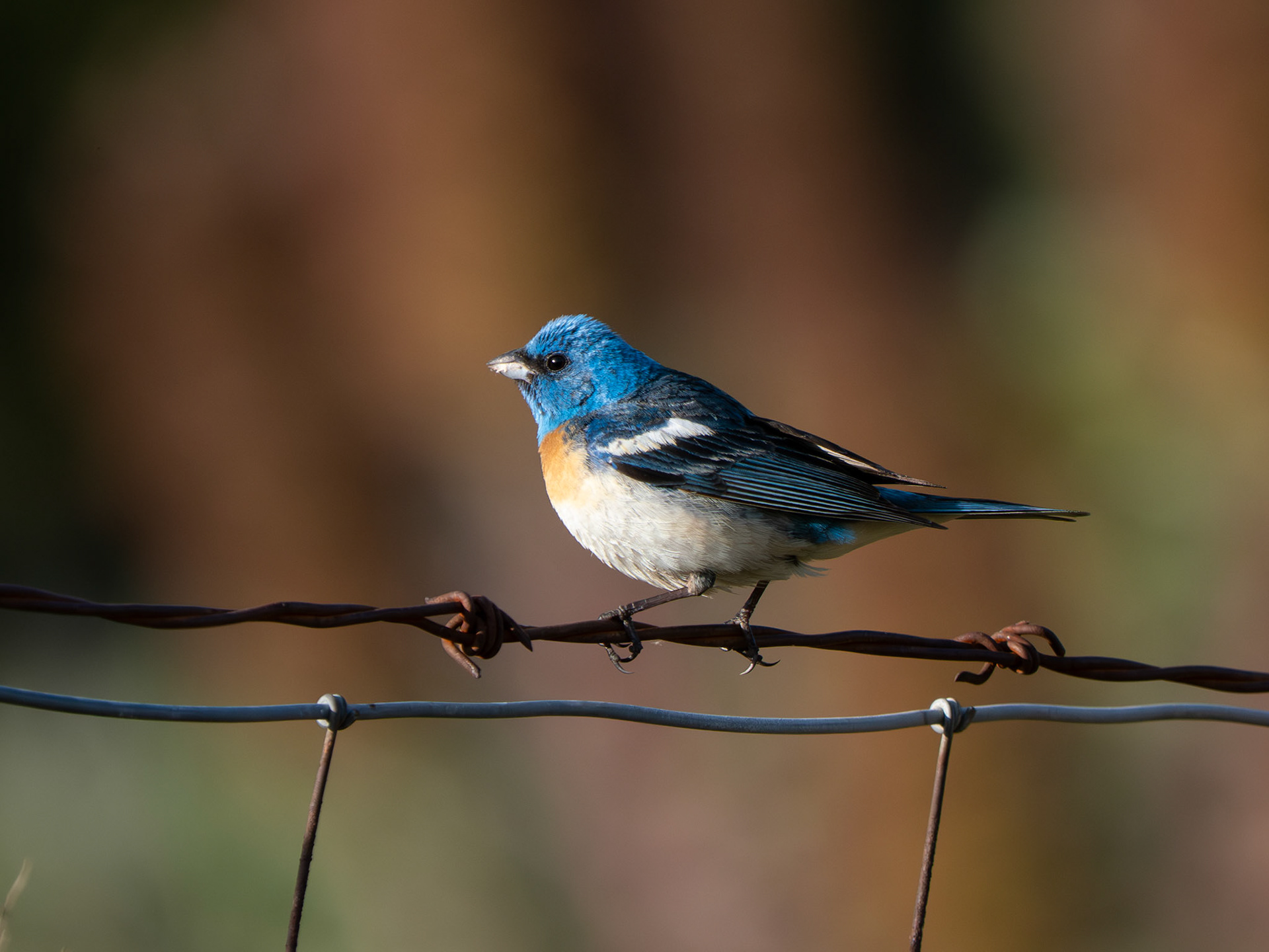 A male lazuli bunting galavants around while the female is hard at work catching grasshoppers (Milpitas, CA)